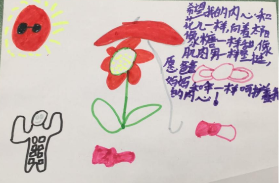 地用绘画来表现自己的心情。同学们在绘画的过程中充分地感受自己,表达自己,将活动的氛围推向了高潮。孩子说画画的感觉真好啊,可以尽情地表达自己的心情,很放松!很兴奋!
