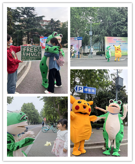在“自由拥抱”活动中,工作人员身穿皮卡丘和孤寡青蛙玩偶服,赠予同学们温暖的拥抱和问候。自由拥抱活动是一个无论年龄、性别、身份都欢迎参与的公益活动,它鼓励人们在自己生活的空间里,给彼此一个真正的拥抱,体会更多的关爱和理解。