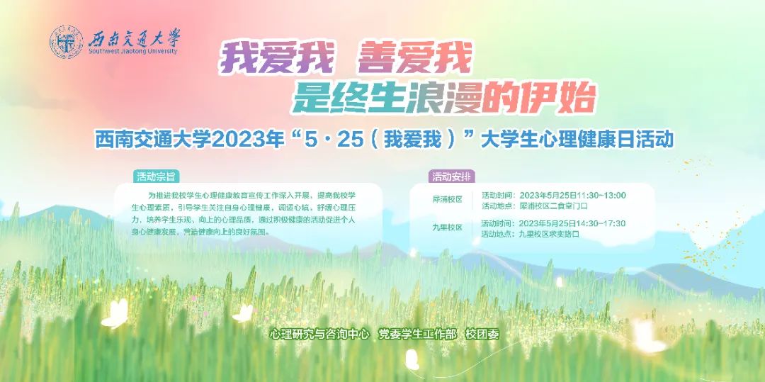 每年的5月25日是全国大学生心理健康日,取谐音“我爱我”,意在提醒大学生关爱自我心理成长,促进自我身心健康。为更好促进大学生“关爱自我,了解自我,接纳自己”,关注自己的心理健康和心灵成长,2023年5月25日,西南交通大学在犀浦校区和九里校区同步举行了“5•25(我爱我)”大学生心理健康日“5•25,有我,爱我”活动。本次活动由澳门六合彩开奖直播(中国)官方网站
