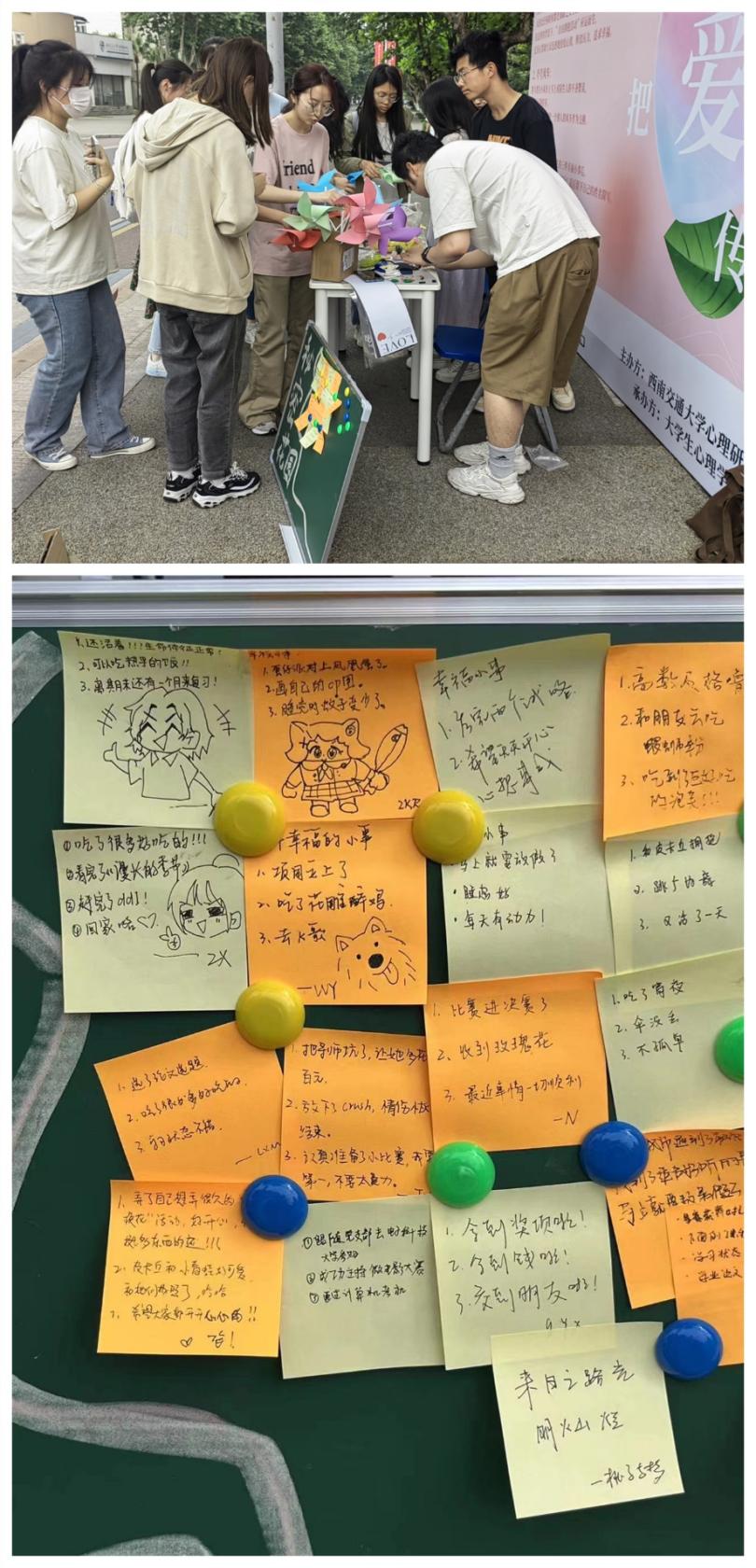 在“秘密花园”活动中,参与的同学用便利贴写上近期发生的三件幸福小事,然后将其贴在展板上。同学们用三句话简单概括自己的幸福,在便签上涂鸦自己的快乐,最后留下自己的姓名简写,贴在展板上将自己的幸福与快乐传递下去。该活动让大家感受到了人间温情,让大家学会从平凡的小事当中挖掘美好与幸福的瞬间,从而提升大家的幸福感。
