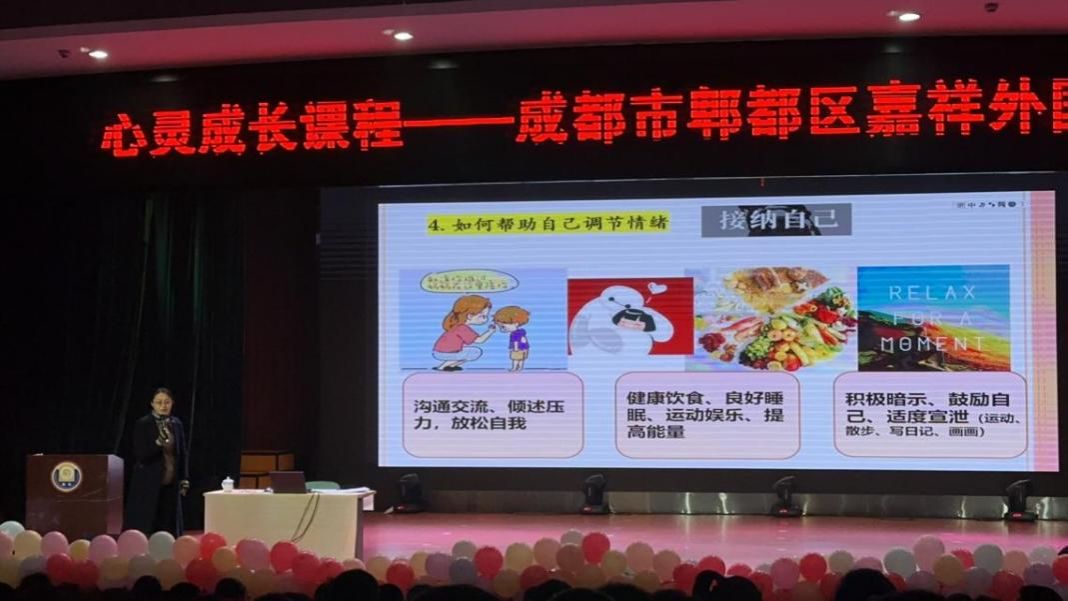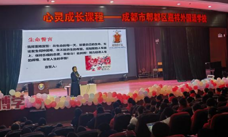 唐静老师受邀到成都市郫都区嘉祥外国语学校小学部开展了一堂心灵成长课。唐老师与全校五、六年级师生共500多人共同完成一次心灵之旅,主题为:珍爱生命、情绪压力调适。