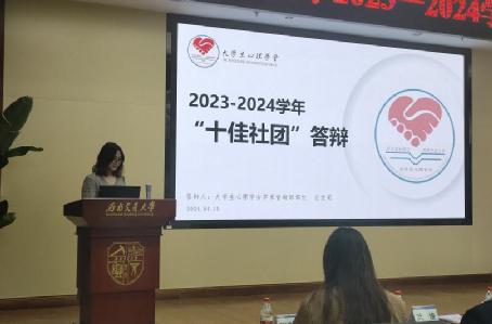 2024年4月11日下午,由校团委举办的2023-2024年度十佳学生社团答辩会落下帷幕。经过激烈角逐,大学生心理学会从17个参选社团中脱颖而出,荣获“西南交通大学2023-2024学年十佳社团”荣誉称号。
