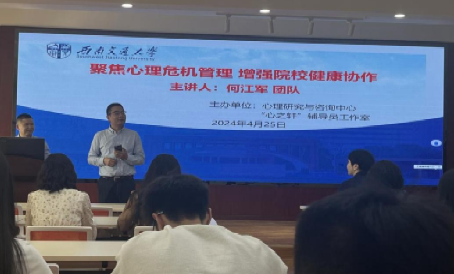 为提升校医协作能力、高质量运行心理健康绿色通道,2024年4月25日(周四)上午在犀浦校区X5501教室举办了题为“聚焦心理危机管理 增强院校健康协作”的培训会暨研讨会。成都市第四人民医院心理测评澳门六合彩开奖直播