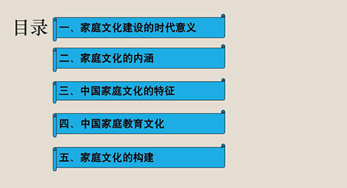 唐静老师从五个方面来讲解家庭文化建设。第一是家庭文化建设的时代意义;第二是家庭文化的内涵;第三是中国家庭文化的特征;第四是中国家庭教育文化;第五是家庭文化的构建。