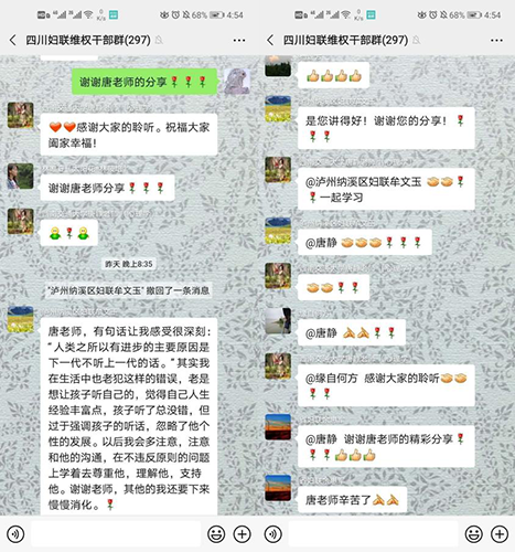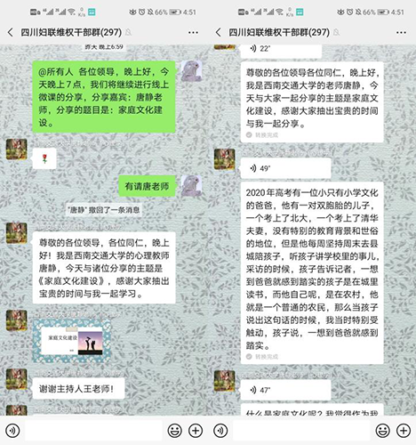 承办的婚姻家庭辅导项目线上微课在省妇联维权干部群中展开。此次微课的主题是“家庭文化建设”,主讲老师为科普基地的唐静老师。