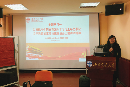 全体教职工在犀浦校区X5322会议室开展业务学习,深入学习《习近平总书记教育重要论述讲义》,此次业务学习由刘咏梅书记领学。会议由陈华主任主持。