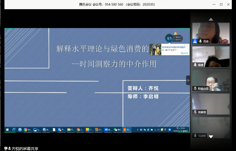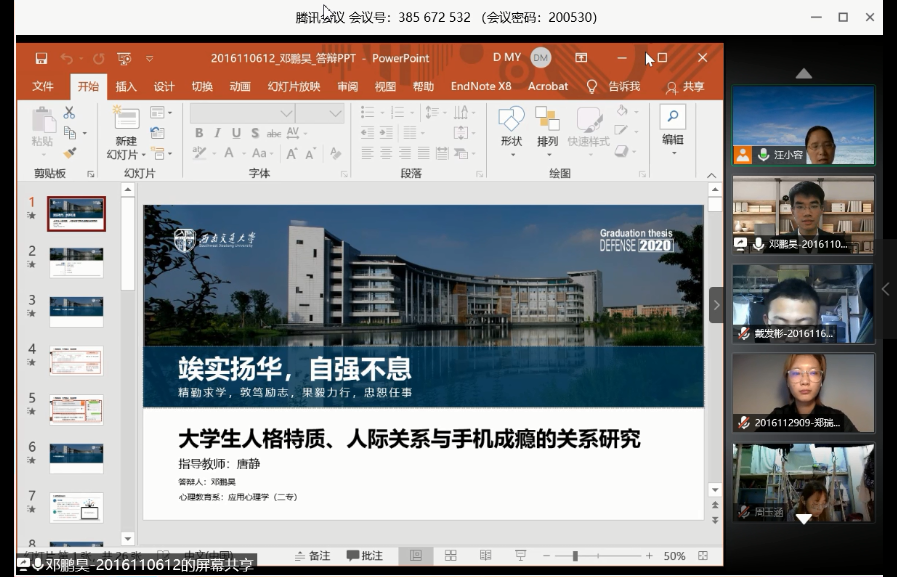 应用心理学专业2020届本科生毕业设计(论文)院级答辩如期在在腾讯会议平台举行。答辩学生以屏幕分享的方式向各位评委老师和其他同学展示自己毕业论文,并介绍包括选题意义、文献综述、研究方法、研究结果、讨论分析、结论与研究不足等内容,充分展示出自己大学四年的学习成果。