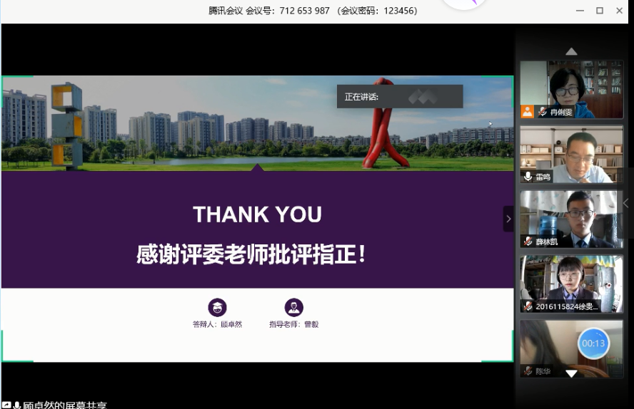 中午13时,本次校抽样答辩圆满结束。评委老师和答辩同学进行网上合影留念。受答辩组长委托,雷鸣老师就校级抽样答辩进行总结发言,感谢了今天参加答辩学生及其指导老师近7个多月的努力和付出,给大家展现出了符合质量要求的毕业论文,达到了学校提出的要求。同时,对接下来的院级面上答辩提出三点具体要求:一是在答辩之前再完善毕业论文,增强研究的理论支撑,重点是完善问题提出和结果解释部分;二是在答辩之前,务必要完成各项检查工作,准备查重报告、外文翻译、指导记要等各项材料;三是重视答辩环节,抓住重点和精华。答辩要能放能缩,善于总结论文的精华和创新之处。