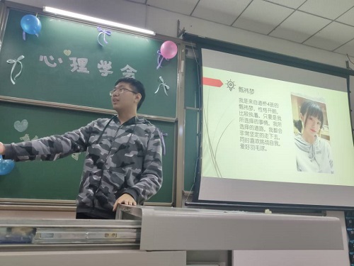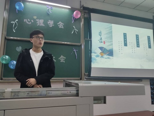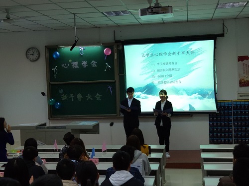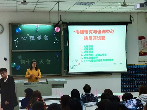接着,大学生心理学会副会长刘慧辉介绍心理学会。学会成立于2000年,致力于服务学校的心理健康活动,服务于老师的教育教学,服务于同学心理健康知识的传播与普及,更起着联络与沟通的作用。心理学会设有学术部、办公室、宣传部3个部门。今年共有四十五名新干事加入大学生心理学会,连同原有的干部同学,学会共有五十五名学生和三名指导老师。相信在老师的指导和同学们的共同努力下,西南交通大学峨眉校区心理学会将展现独有的风采。