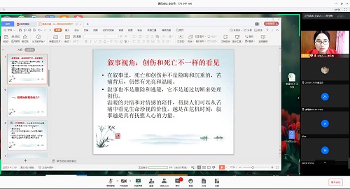 介绍完如何看待死亡之后,李老师又向同学们介绍了叙事视角如何看待创伤。在此之前,李老师引导同学们认识了人在面对创伤时的韧性以及见证了创伤的不容易之处。在此基础上,李老师强调了叙事里的一个重要理念:双重故事。我们不仅要看到负面的故事,更要看到有哪些难得的故事,有哪些不容易的故事,在这些故事中去回顾我们是如何照顾自己、如何生活、如何在痛苦中坚持学习和工作的,从这些克服创伤的行动中汲取力量,继续前行。最后李老师同样让同学们在线上分享自己身上发生的一件有关创伤的故事,在分享中进一步体会其中的含义。