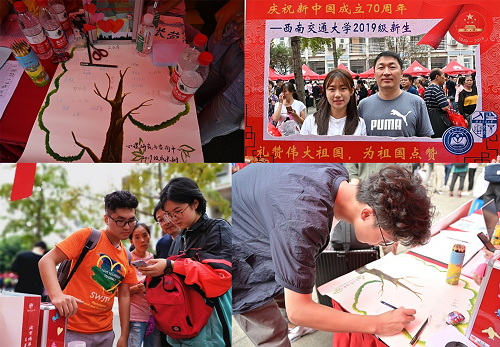 学生会在一食堂门前举办了以庆祝新中国成立70周年为主题的迎新生活动。一张张热情的笑脸,一句句亲切的问候,一项项贴心的服务,欢迎着从祖国各地来到西南交大的莘莘学子。