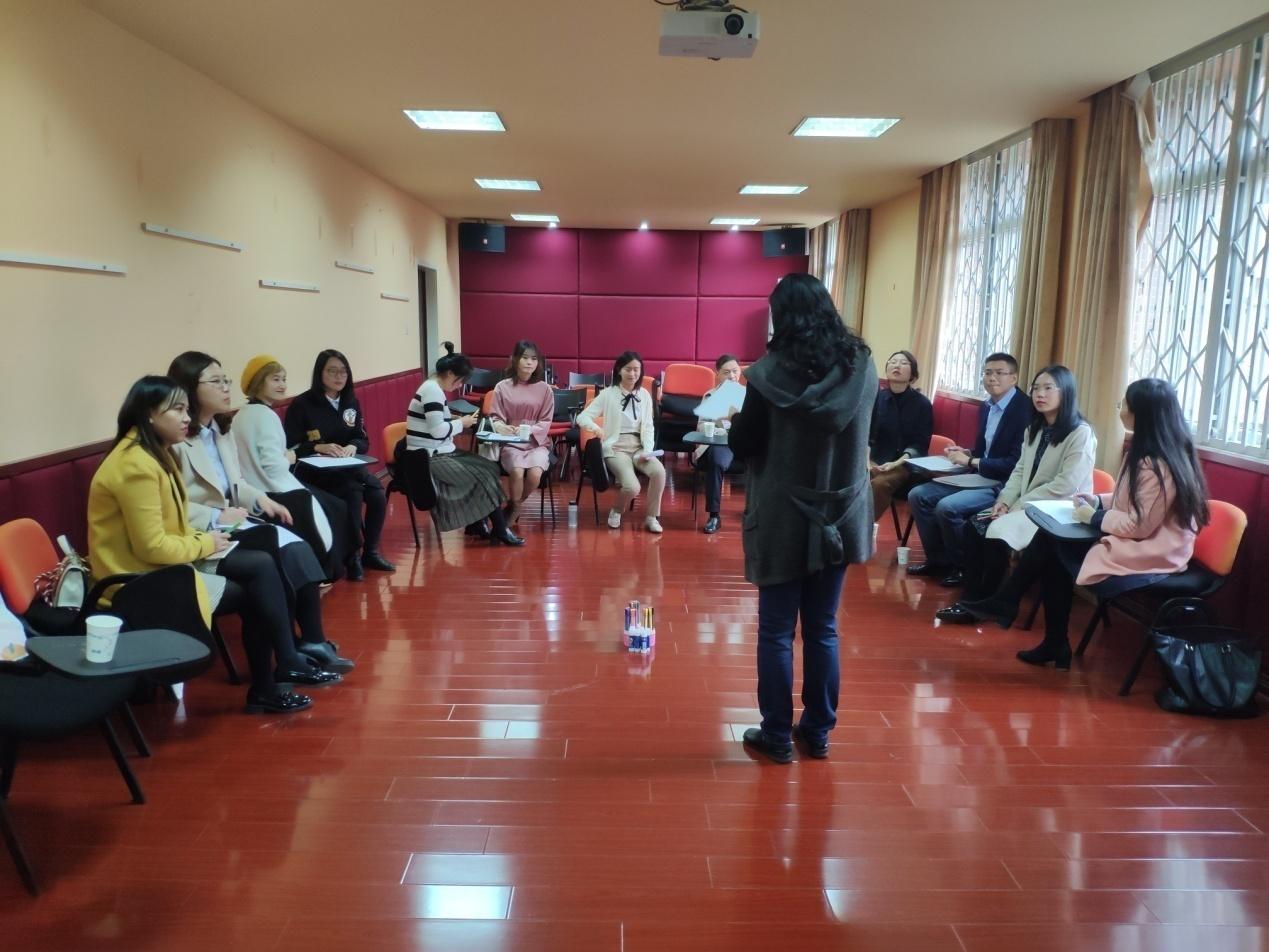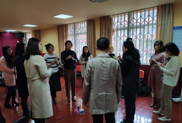 第二个活动是由各位老师在彩笔里选择代表自己家乡的两个颜色并阐明原因,然后在团体中介绍自己。老师们彼此间交流,相互了解。张老师表示:通过介绍自己家乡的特色,可以更快地了解彼此,调节欢快的氛围,拉近心理上的距离,从而进行更深层次的交流。