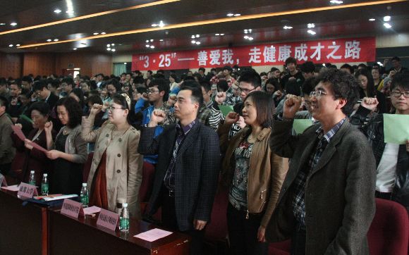 “在这里,我庄严宣誓:我善待自我,温暖拥抱并不完美的我;我关爱自我,乐观激励渴望成长的我;我善待他人,宽容接纳与我不同的人;我关爱他人,热心帮助需要支持的人;我要舞动生命的精彩,做最好的自己,做一名有魅力的大学生!我一定勤奋努力,健康成才,服务社会!建设美丽校园、共创美丽中国!”3月25日中午,在同学们的齐声宣誓下,“3·25善爱我”的健康誓言开始在交大校园内播撒开来,将持续一个学期的2013年西南交通大学“3·25”心理健康教育活动在犀浦校区图书馆二号报告厅隆重启动。