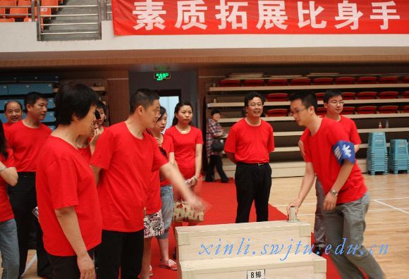 讲座后,机关工作人员以红、黄、蓝、橙、绿五种颜色为标志,分为五个团队进行了素质拓展训练。训练有“安全岛事件”、“生命之旅”、“越狱”三部分,旨在培养团队成员互相信任、互帮互助、通力合作的意识。在“安全岛事件”训练营,团队成员利用手中仅有的几枚轮胎,合作取到沿路的本方颜色的补给水源,最终所有人(包括轮胎)全部站上了安全岛。抢滩登陆训练,让队员直观体验了信任与被信任、帮助与被帮助,以及运动与合作、激情与技巧的结合。“生命之旅”环节,队员被要求旅行全程蒙上双眼、手拉手,在引导员的指引下走过一段地形复杂的路途,挑战心理极限、超越自我,并学会根据客观环境变化,找到有效沟通途径。“越狱”环节,各团队员均被绳索连环打结锁住,在被限制只能使用单手解锁的情况下展开“越狱”行动。此项训练旨在培养队员的“他人意识”,即解开自身的困难需要他人的协助。王顺洪副书记兴致勃勃地参加了素质拓展训练,并对训练中机关工作人员所表现出的良好综合素质给予了充分肯定。