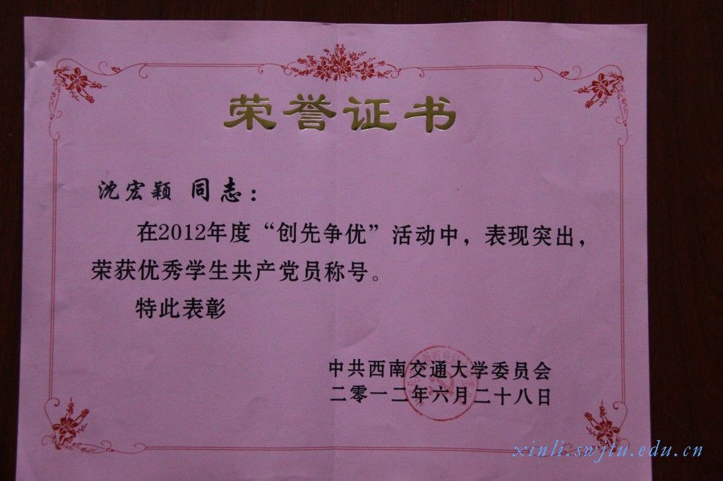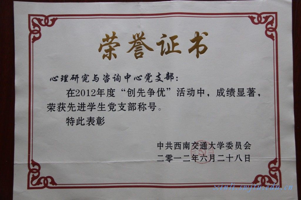 党支部”在2012年度“创先争优”活动中,成绩显著,荣获西南交通大学先进学生党支部称号。
