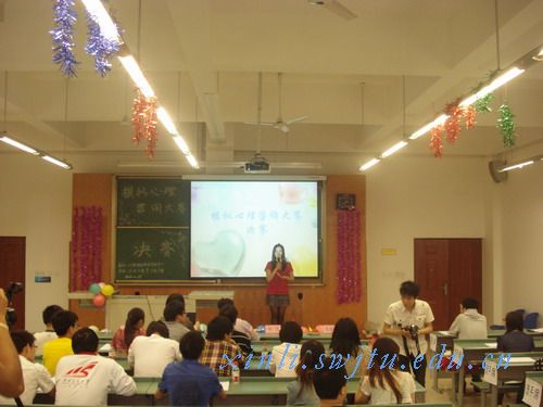 比赛的另一环节则是模拟心理咨询,即选手们亲自当一名心理咨询师,同学扮演来访者。这个环节充分检验选手们运用心理咨询技术的能力。由于时间的缘故,此回合早已举行,只是在决赛的现场播放了选手们的视频,虽然选手们的对于心理咨询师还不算驾轻就熟,出现这样或那样的问题,但还是获得了指导老师们的肯定。视频播放完了之后,指导老师做出精彩点评,准确、深刻地的指出了选手们的问题所在。