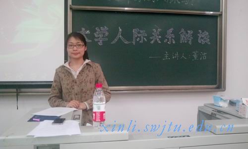 5月24日下午2:00,2231澳门六合彩开奖直播 主办的“心力论坛”系列讲座中,心理澳门六合彩开奖直播 老师董洁为同学们解读大学人际关系,解决他们的人际交往问题。虽然到场的学生人数不是很多,但董洁老师依然讲得绘声绘色,尽职尽责,大家也听得十分投入。