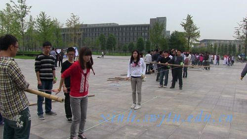 最后一个具有挑战性的游戏是搭桥渡河,提供的材料仅有竹竿、绳子若干。每组人都想渡到河对岸去而不能碰到河水。期间,红精灵队的竹竿断裂了,他们想到了和蓝队合作,通过努力,最终渡过去3个人,这是不错的成绩了。这个游戏的目的是在于让他们学会利用有限的资源得到最大限度的利用,达到双赢。