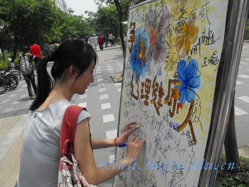 当看到签名板上密密麻麻全是同学们签的名字时,负责南区活动的心力网副团长方敬表示很满意。“这表示我们交大学子对心理健康极大的关注,而且有信心去面对将来的困难和挫折,这也让我们感到莫大的欣慰。”