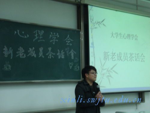 2011年3月17日晚7:00,心理学会在X2316召开新老成员茶话会,暨本学期第一次会员大会。参加本次大会的有心理学会指导老师刘娣以及心理学会全体成员。大会目的在于对新学期的活动流程作出简要安排,新老成员进一步交流,增进感情。