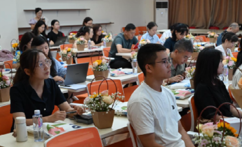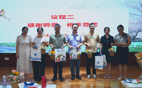 会议第二项议程是“感谢师恩,桃李芬芳”庆祝第四十个教师节活动,刘书记和高主任向教职工代表赠送了包含鲜花篮、充电宝、笔记本和文创帆布袋的教师节礼物,充电宝象征着对教师们持续能量的期望。