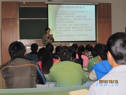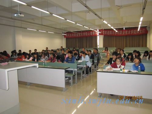 2010年10月15日上午9:00,我校澳门六合彩开奖直播 对地震灾区四川水利职业技术学院大一的心理委员进行了一次生动的培训讲座。目的在于帮助他们提高水平,明确职责,带动影响并帮助其他同学以积极、阳光的心态去生活。讲座由心理澳门六合彩开奖直播 马淑琴老师主讲。
