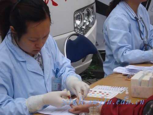 中午,前来献血的同学越来越多,很多同学未吃饭就排队等待献血,他们的无私奉献精神值得我们学习。艺传学院副院长甘霖老师也前来三食堂前献血,并给灾区人民送上了真诚的祝福:“爱心凝聚,玉树长青”。聚集的爱心像春日的屡屡阳光,温暖着玉树人民的心。
