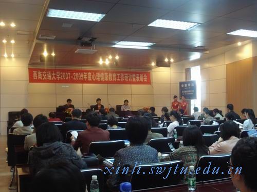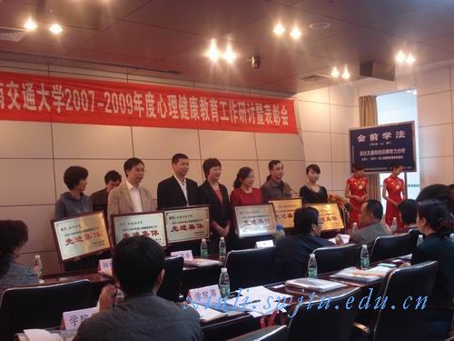获得西南交通大学2007—2009年度心理健康教育工作先进集体称号,全校51名优秀心理工作者获得西南交通大学2007—2009年度心理健康教育工作先进个人称号,顾利亚书记和朱健梅副书记共同为获奖者颁奖。