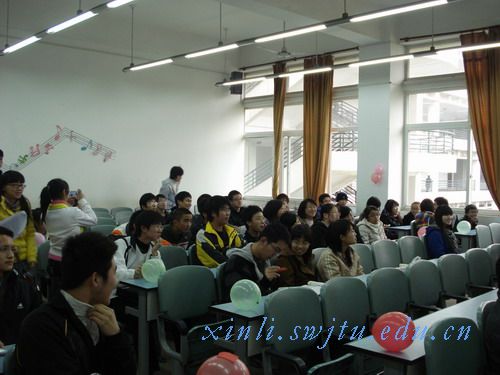 随后是游戏互动环节——男女搭讪现场表演和“含水传歌”。以抽签的方式随机从现场观众中选取表演人员,围绕诸如“郁闷的你在浙园遇见郁闷的她、虹桥撞车、在图书馆第三次与她相邻而坐、在春熙路遇见似曾相识的她”等场景,让表演人员随机应变即兴表演,既体现了学会的宗旨,又增加会员间的感情,将现场气氛带入一个又一个的高潮。