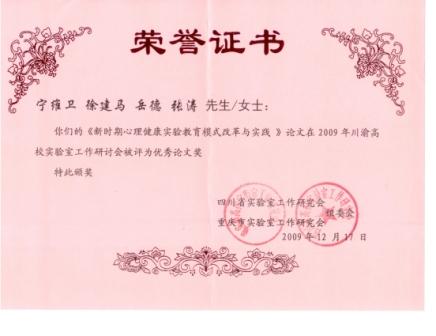 由宁维卫、徐建、马岳德、张涛提交的论文《新时期心理健康教育模式改革与实践》的获得与会专家肯定,获得优秀论文奖。