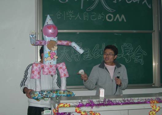 在首先进行的DIY展示中,各组向大家展示了形态各样的手工作品,并讲解了各自作品新颖的创意。接着是本晚的主题活动“思维大挑战”。各个小队踊跃参加热身题、抢答题、风险题、视频题、动手题一系列活动,开动脑筋解决各种难题、怪题,而其中最精彩的项目该算动手题了:各个小队要在指定时间内用规定的材料做出一样容器,使鸡蛋在这容器的帮助下从最低一米的高度落下不破损。主持人一声令下,各个小队马上聚集在一起制定方案,并将方案付诸于现实,把灵感变成现实,最终嘉宾队率先完成了任务,博得了全体会员们的欢呼声。而其余各小队也先后在指定时间内完成。趁着评委的评分时间,代会长向会员们分配了OM大赛的一些相关工作,最后“策联队”成为本次活动的总冠军。