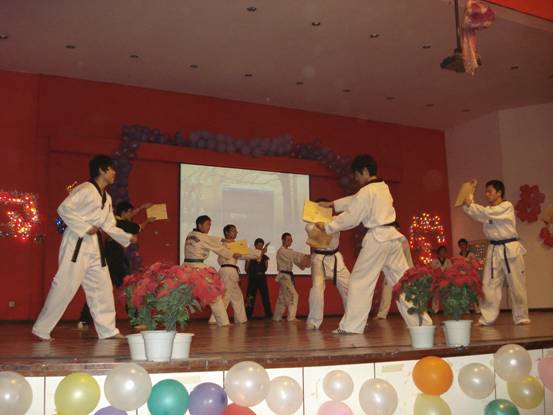 晚会的高潮是跆拳道协会的跆拳道表演。先是集体招式表演,然后是两位身着武士袍的拳手表演双截棍,一招一式,让人不禁想起了《精武门》和那永远的传奇——李小龙。同样出彩的还有黑带选手表演的截木板、横踢竖劈,伴着劲爆的音乐,可谓英姿飒爽。观众们的欢呼声也一浪接着一浪。