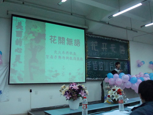 西南交通大学交通运输学院心里俱乐部承办的“花开无语”交大本科校区首届手语培训后期汇演于12月5日晚7点半在X2321教室拉开了帷幕。到场的嘉宾包括了成都市残疾人联合会的专业老师、前沿网总编刘思文、交通运输学院心灵俱乐部前任及现任会长等。