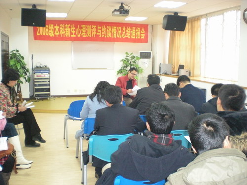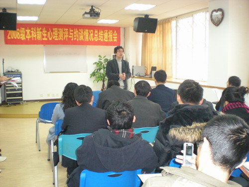 以及各院系的工作表示满意并表示深深的感谢。她说2008年我们共同经历了很多风波,但各项工作还比往年做得好,在此对老师们所做的努力表示感谢。学校党政非常重视心理健康教育工作,目前学校正在扩建更多的新功能的心理健康教育实验室和心理学实验室。朱书记还指示,今后的心理健康教育工作还需要进一步深入,并扩大覆盖面,除关注在校的本科生、研究生外,还要关注留学生、在校教职工等,分层次为类别地开展工作。希望组织案例交流研讨会,定期开展辅导员培训,对新问题开展专题等。