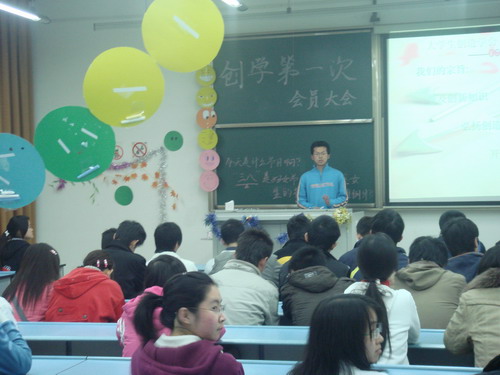 在被一张张可爱又奇特的娃娃脸包围的2424教室中,2009年3月8日晚上七点半大学生创造学会的会员们迎来了09年新学期的第一次会员大会,会场的创造性布置,主持人的创造性发言,无不展现了创造学会的宗旨“普及创新知识,弘扬创造理念,开发大学生创造力”。