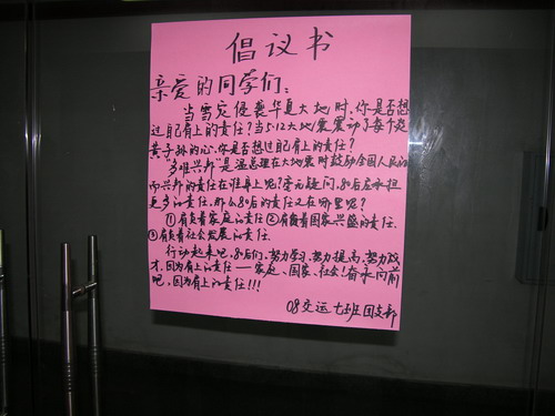 活动的最后,主持人给大家展示了一份倡议书。教室里一下子安静了下来,大家都在认真地默读着。倡议书上写着:“当雪灾侵袭华夏大地时,你是否想起自己肩上的责任?当5.12大地震震动了每个炎黄子孙的心,你是否想过自己肩上的责任?…”当同学们读完这份后,纷纷在倡议书上按下了自己的手印,并在心底庄重地宣誓:“我们为身为80后而骄傲,我们有信心,有能力担负起中华民族崛起的重任”。