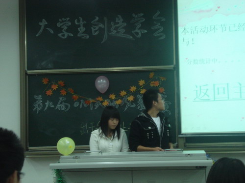 比赛的第一个环节是让各个队伍根据自己队的队名设计出自己的队训、队歌并且还要摆出一个有创意的POS,这一切又要求队员们在10分钟内完成,最后每个队会有两分钟的时间上台表演。比赛开始,教室里开始热闹了,每个队伍在都抓紧这有限的10分钟时间设计自己的队训、队歌和POS。各个队伍都充分发挥自己的想象力,设计出了独特的队训、队歌和与众不同的POS,并且都采用了不同的方式去表演。先看“孔明又孔明”队,他们在音乐的伴奏下用R&B说出了自己的队训和队歌,最后的POS也别具一格的在音乐的背景下跳出来了;“六匹狼队”的六个男生也毫不示弱,他们用他们的动作、言辞展示男人的阳刚之气;最后“cc-Evolution队”也巾帼不让须眉,四个女生用表演和歌声来诠释了女性一生“evolution”的全过程。