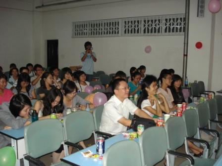 在悠扬的《月光》伴奏下,08级心理1班的“中秋迎新晚会”正式拉开了帷幕,随着主持人赵德圣同学和程婷同学那风趣幽默的开场白,晚会的气氛渐渐走向了高潮。