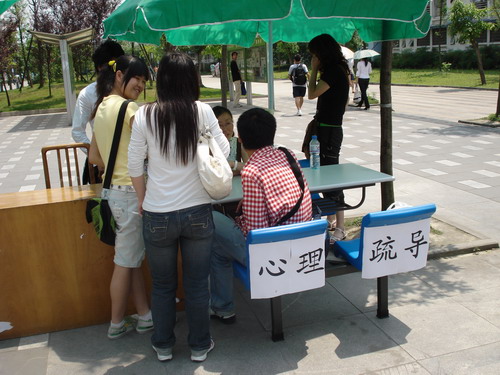 的老师在地震后的第三天,就开始为同学们进行心理咨询。因为震后咨询室房屋不能进入,但是还是有同学需要心理疏导,于是我们就做了现场咨询。地震后不久,在犀浦校区一食堂、三食堂、四食堂门口,九里校区三食堂门口、求实路口都展开了现场咨询。第二,澳门六合彩开奖直播