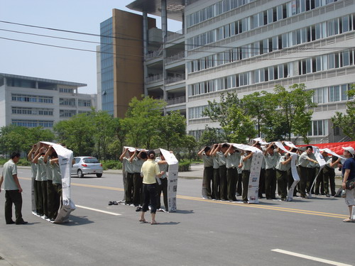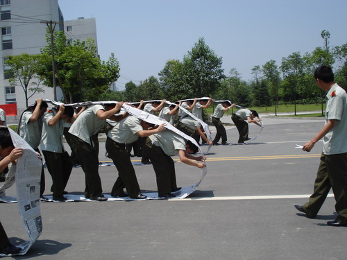 时至正午,骄阳似火。最后一项活动“团结向前进”又在五号楼前拉开帷幕。要求每组队员在20分钟内用18张旧报纸做一个“烽火轮”(形状类似于坦克的履带),完成后全队所有人员站在烽火轮中一起向前行进规定距离,在行进过程中如果烽火轮出现破损、断裂,必须停下来原地修补,之后继续前进。六组同时行进,进行比赛。一场别开生面的“军事演习”就地展开。六组队员集思广益,分别制作好了作战工具“烽火轮”。一声哨响,队员们小心翼翼地在纸质的烽火轮里开始行进了,不少参赛队伍在途中不断用胶布修补自己的作战工具,挥汗如雨,走走停停;也有一开始就比较顺利的队伍,他们的烽火轮“坚不可摧”,五人踩在上面也豪无破损,为他们的比赛胜利赢得了不少时间。两轮比赛下来,同学们还沉浸在游戏的欢乐当中,欢声笑语响彻交大校园。