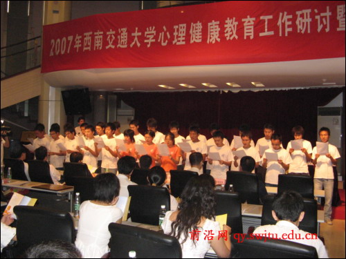 最后,随着轻扬的音乐声在多功能厅上空响起,来自土木学院的学生深情地朗诵了《健康三字经》,2007年西南交通大学心理健康教育工作研讨暨表彰会圆满结束。 |