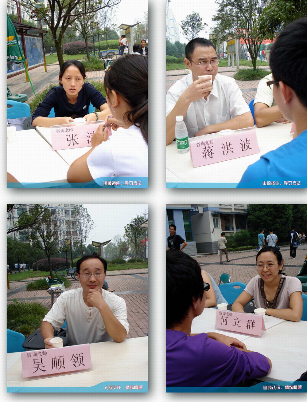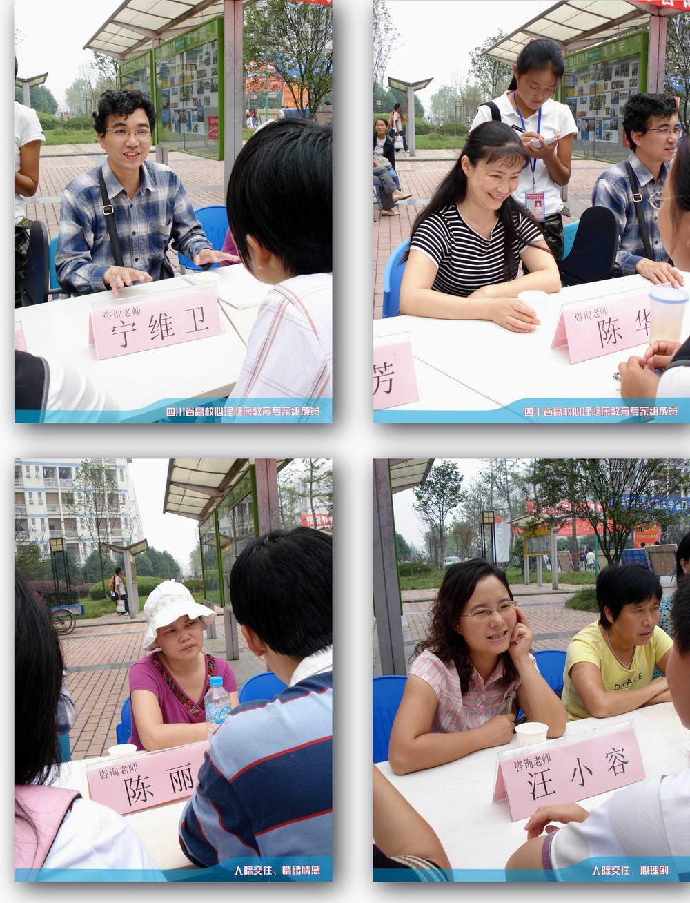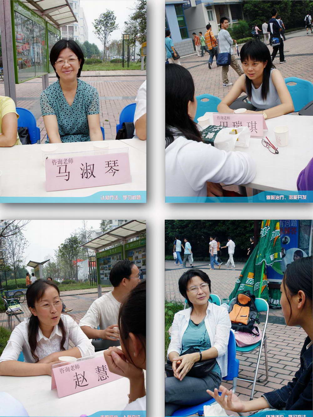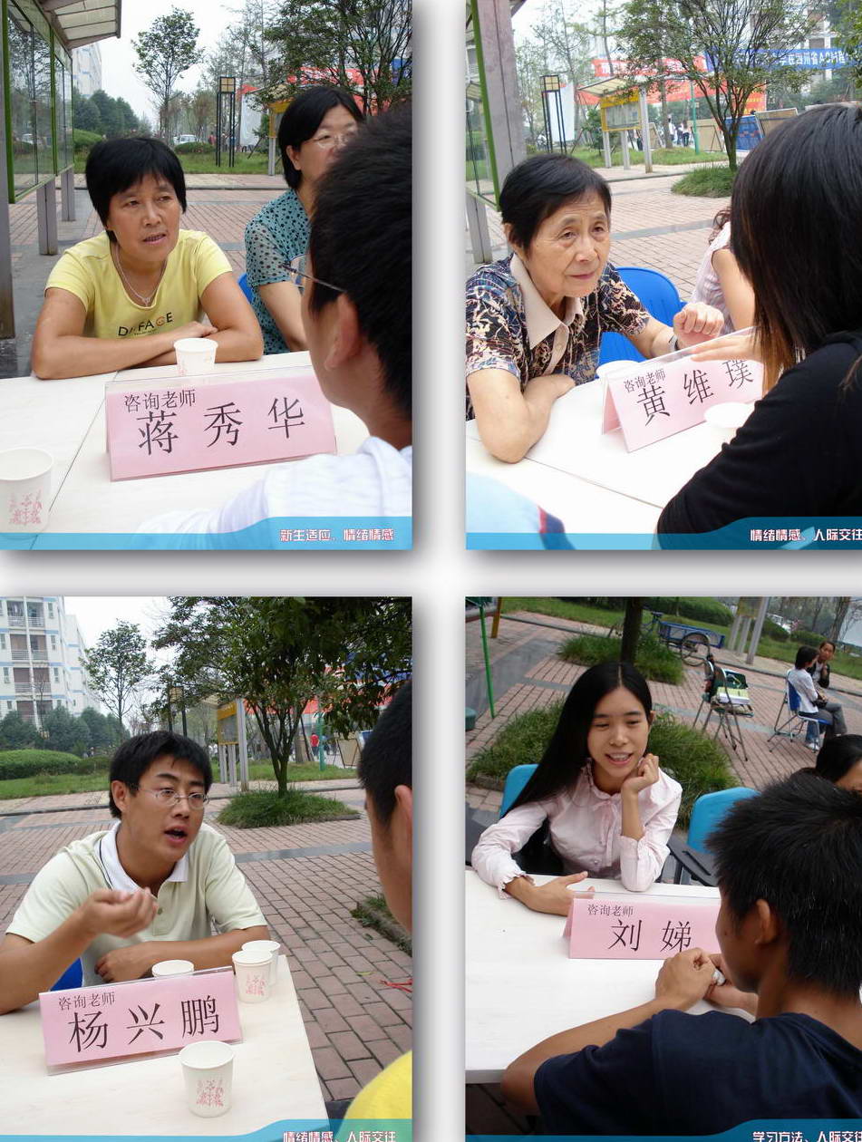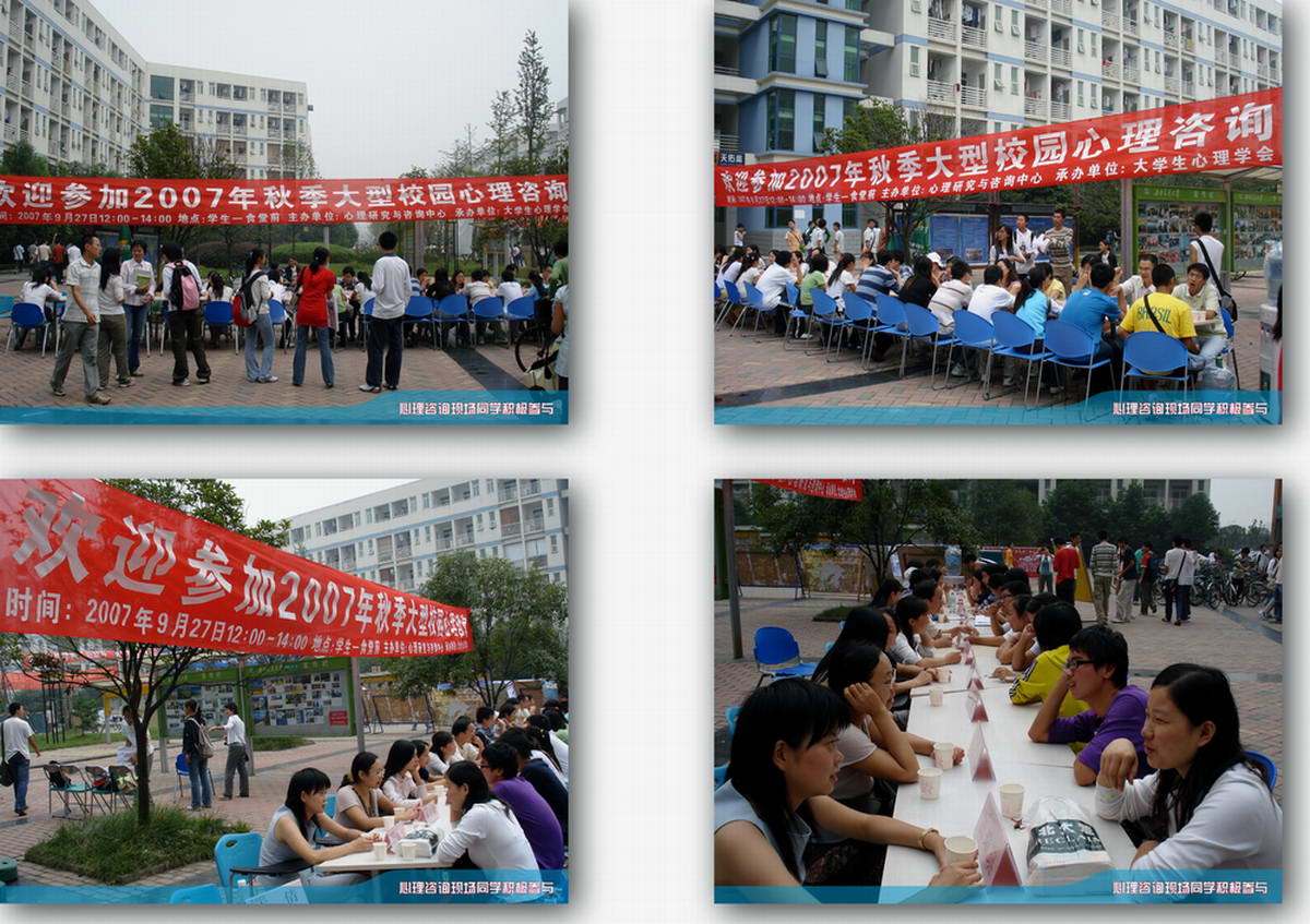 本站讯 九月二十七日中午十二点,犀浦校区一食堂门口“2007 秋季大型校园心理咨询”活动拉开帷幕。来自心理研究与咨询的近20名专兼职老师来到现场为同学进行咨询。前来咨询的同学一直络绎不绝,老师们也忙得不可开交,每位老师面前的同学也是一个接一个,四周还一直站着许多等待的同学。咨询活动一直持续到下午二点钟圆满结束。