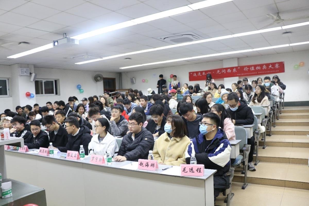 首先,主持人对本次比赛的背景及意义做了简要的说明,同学们也对即将开始的竞拍环节期待满满。第一环节是“商品竞拍”环节,即采用虚拟拍卖的活动形式,给予每个参赛小组5000元的虚拟货币作为资本,对21件“价值”拍品(包括爱情、美貌、自信、良心等)进行竞拍。每件拍品500元起价,每次加价200元起,价高者获得拍品,但是每组出价总计不超过5000元。(选手在活动前并不知道“价值”出现的顺序,以及每个“价值”对应的分值。)竞拍活动非常激烈,甚至有小组为同一个“价值”不断加价,同学们的积极参与让现场的气氛也热闹了起来。