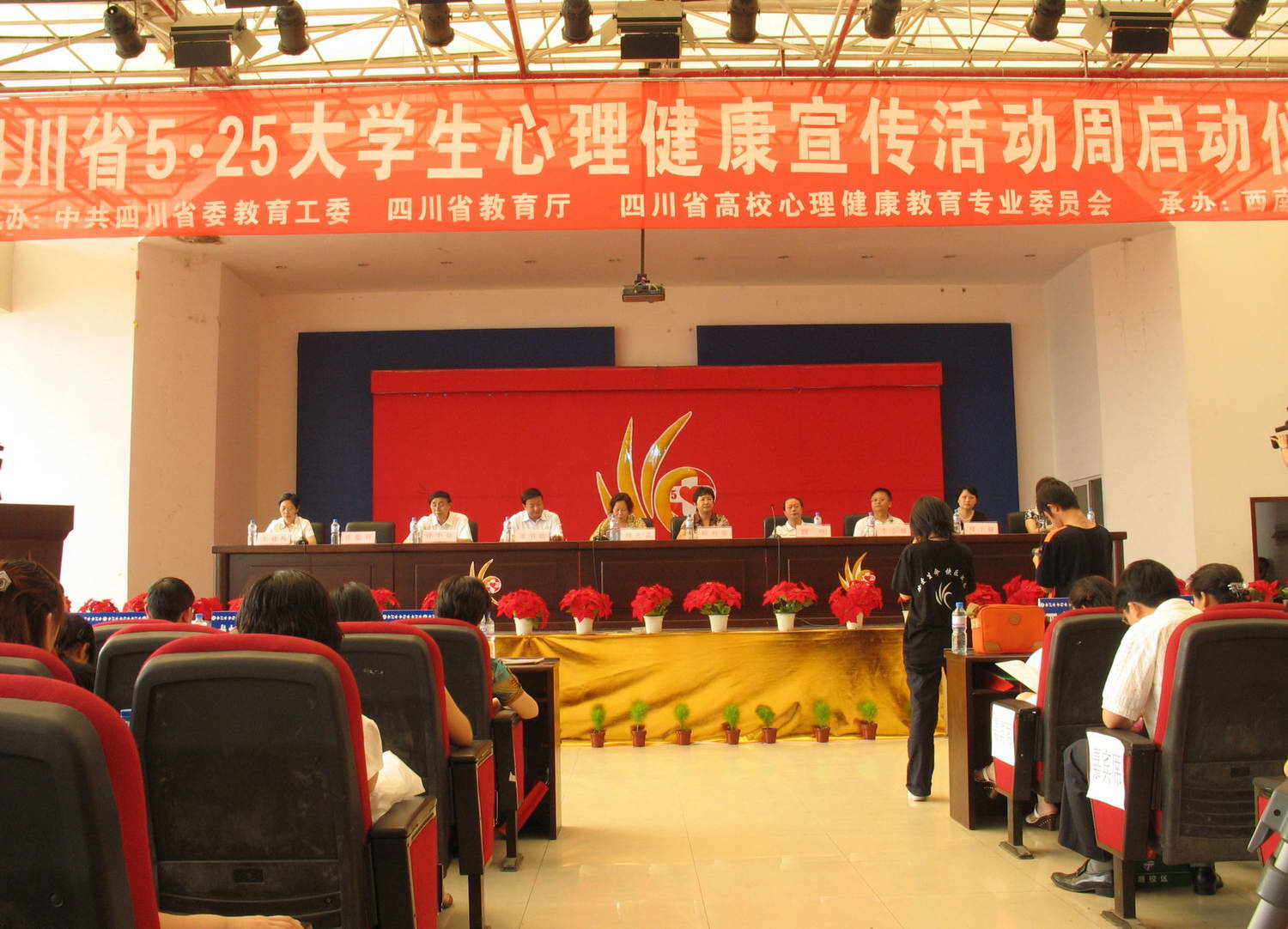 5月25日,2007年四川省高校“5.25”心理健康教育宣传周启动仪式在西南交通大学犀浦校区隆重举行。来自省教育厅的领导以及12所高校的领导、心理健康教育专家、老师和同学两百多位代表参加了此次仪式。中共四川省委教育工委委员、教育厅党组成员周光富同志、西南交大党委书记顾利亚教授、副书记朱健梅教授,省教育厅思政处处长曾中良、省心理学会会长李小融,省高校心理健康教育专委会主任肖旭等领导就座主席台。