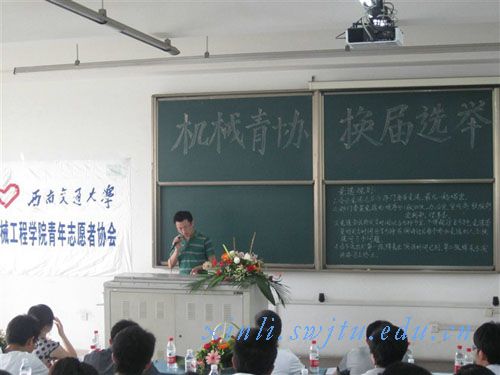 2012年5月20日14点整,由西南交通大学校团委主办,机械工程学院青年志愿者协会承办的换届选举大会在x2520隆重举行。指导老师刘景明,青年志愿者协会会长窦志亮,李文涛,谭玲,章健以及各部门部长及全体干事出席了此次大会。