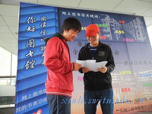 2011年11月14日中午11点半,由校图书馆和机械工程学院团委主办,机械工程学院青年志愿者协会承办的“你好,图书馆”活动在一、二、四食堂门口和图书馆举行,这次活动旨在让更多的交大学子对网上图书馆有进一步的了解,让书香之气传到交大的各个角落。宣传部部长胡东泽、肖洒、陶仕东以及办公室部长张琪带队参加了这次活动。