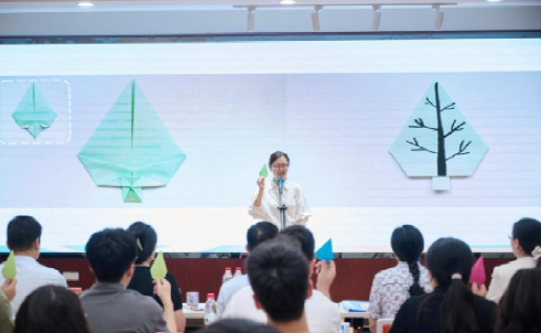 心理健康教育教研室副主任冯缙在现场带来了一场折纸体验活动。每位参与者在冯老师的带领下,将一张小方纸折叠成了一棵小树,并写下自己对心理健康的承诺。在折纸活动中大家体验到困难与挫折,也感受到求助的力量与助人的快乐,最后大家举起自己手中的“树苗”,一起喊出“绿色心灵,向阳成长”的口号。