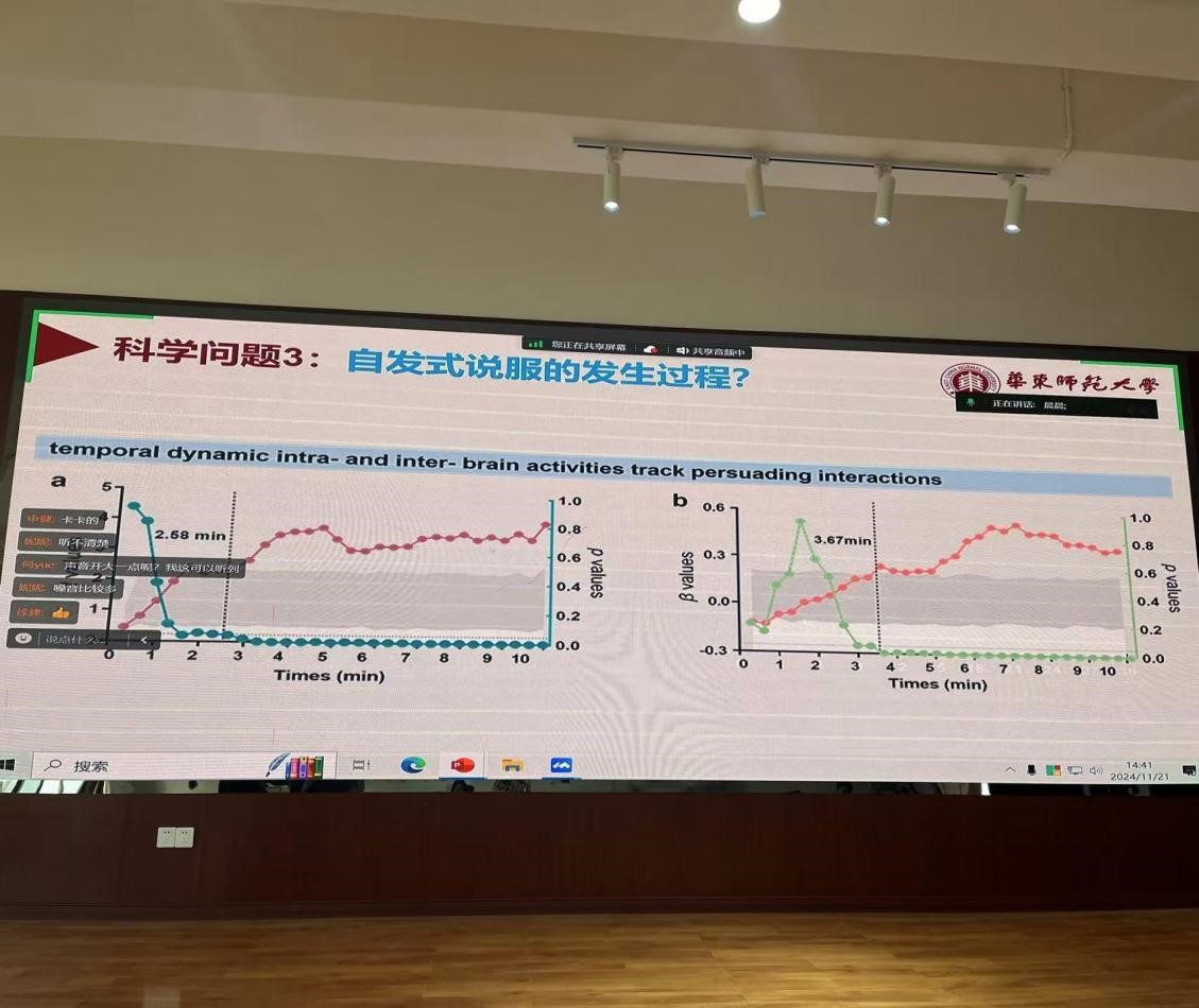 讲座伊始,李先春教授深入探讨了说服行为的神经科学基础,这是社会心理学和认知神经科学交叉领域的一项前沿研究。他首先定义了说服行为:通过言语或非言语信息传递,促使目标受众自愿改变观点或行为的社会活动。接着,分享了其团队采用基于近红外成像的超扫描技术及行为分析等技术,结合行为、视音频解码、脑活动等多模态观测指标,考察说服发生过程、人际交互特点以及动态发生规律的最新研究成果。这些研究揭示了人际互动视角下的说服行为发生过程,并建立了人际沟通情境下的说服认知神经模型。