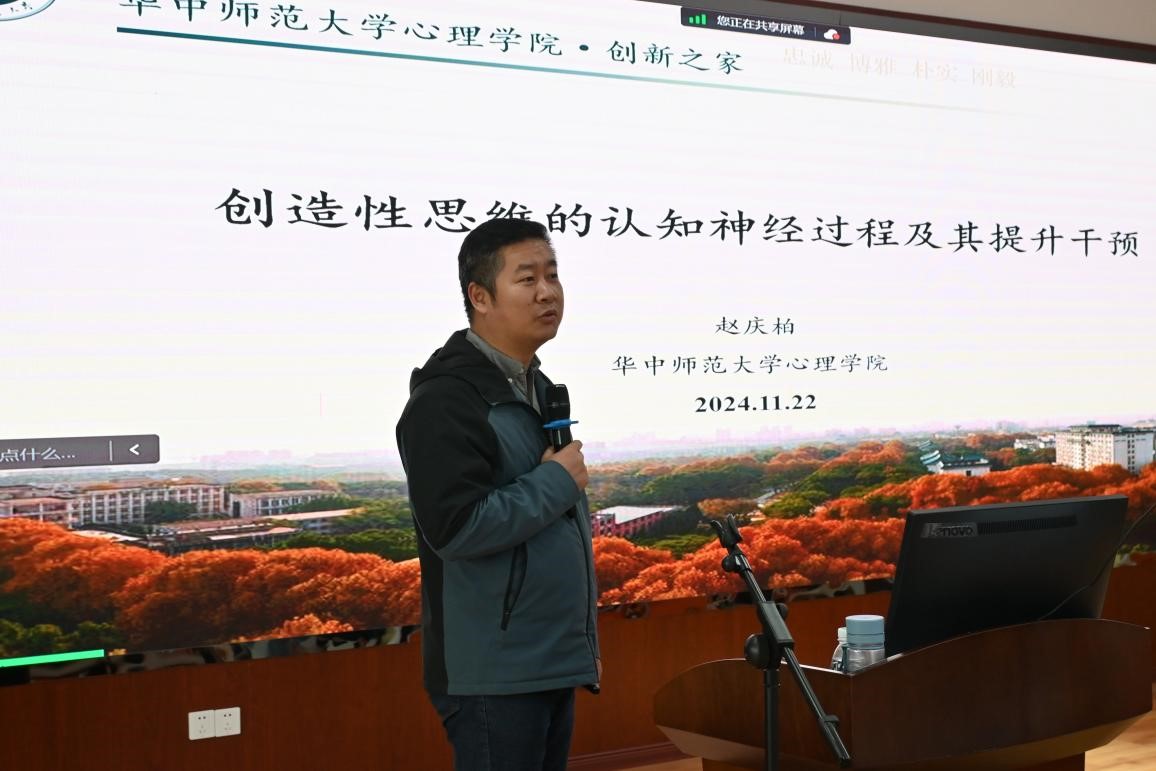 讲座伊始,高雪梅主任简要介绍了赵庆柏教授的学术背景。赵教授是华中师范大学心理学院副院长、博士生导师,同时也是桂子青年学者。他活跃于多个学术组织,并在大连理工大学获得神经信息学博士学位。赵教授的研究覆盖创造认知神经机制、创造力培养和网络学习等领域,主持参与了17项省部级以上科研项目,并在国际学术期刊上发表了50余篇论文,荣获湖北省社会科学优秀成果奖2项。