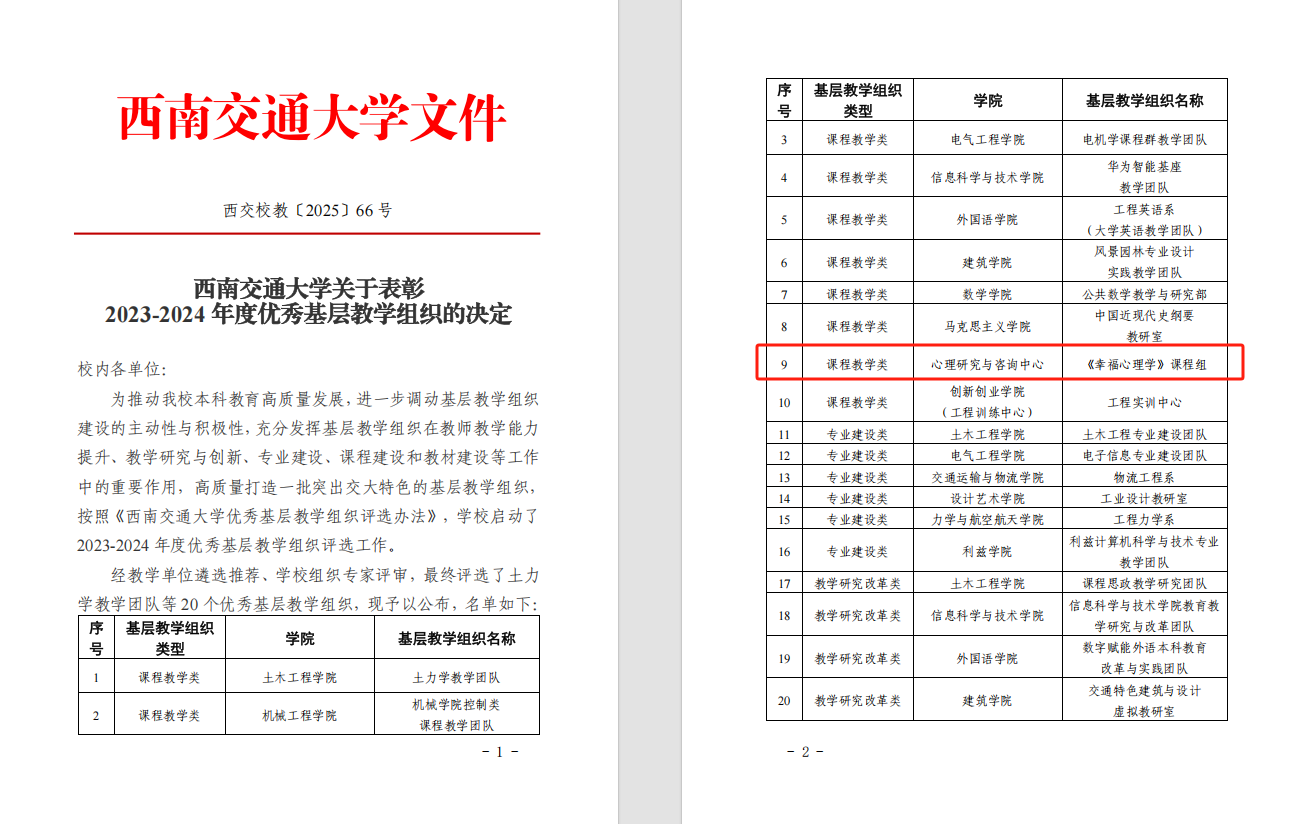 按照《西南交通大学优秀基层教学组织评选办法》(西交校教〔2025〕21号),学校启动了2023-2024年度优秀基层教学组织评选工作。经教学单位遴选推荐、学校组织专家评审,最终评选出土力学教学团队等20个优秀基层教学组织。《幸福心理学》课程组获评优秀基层教学组织。